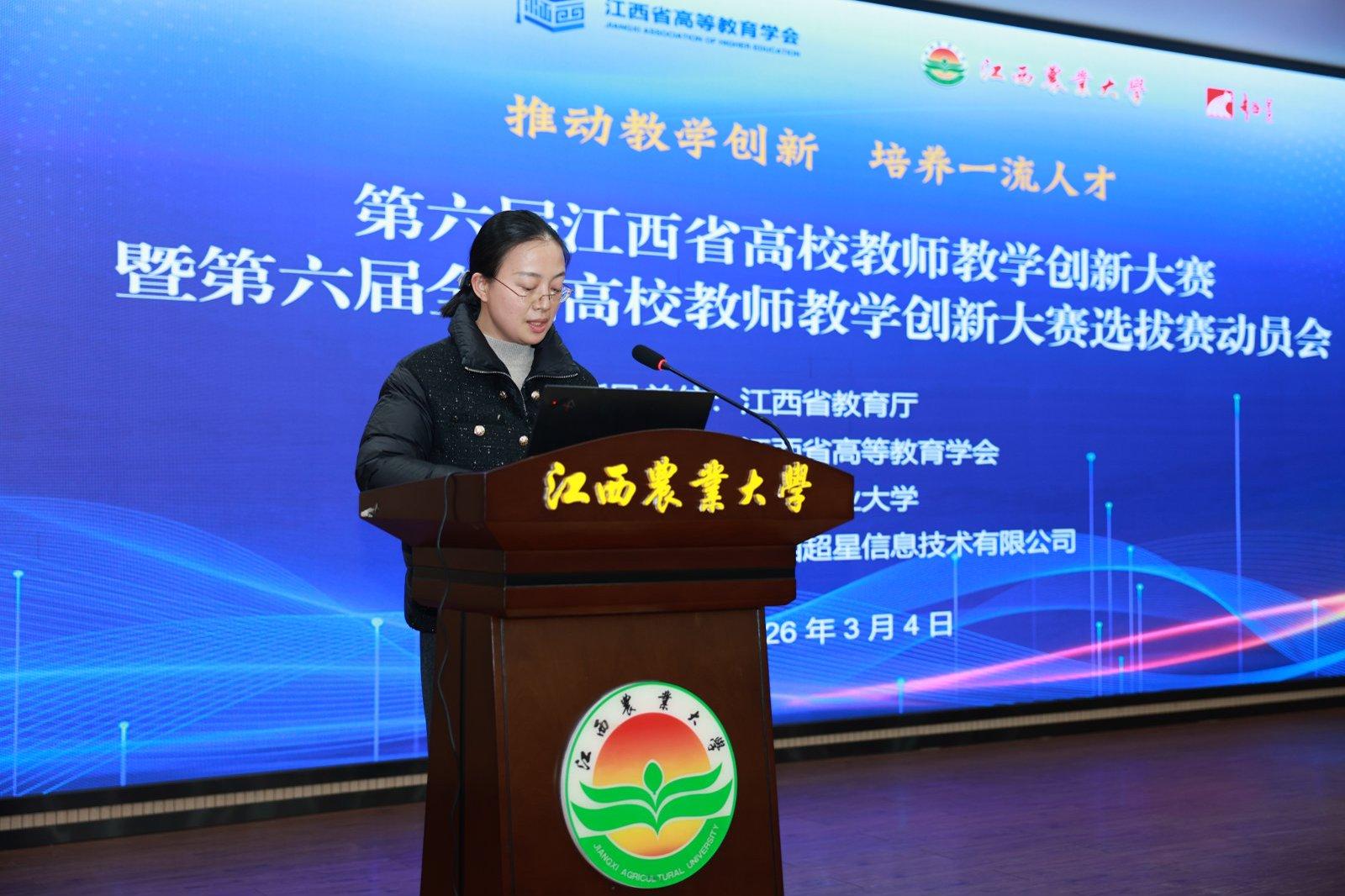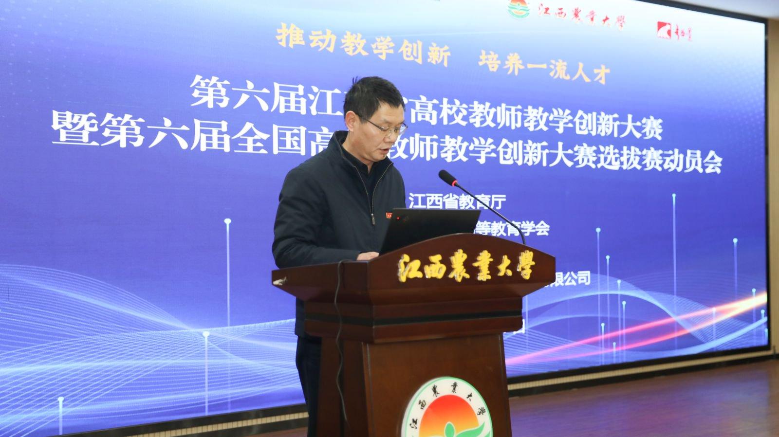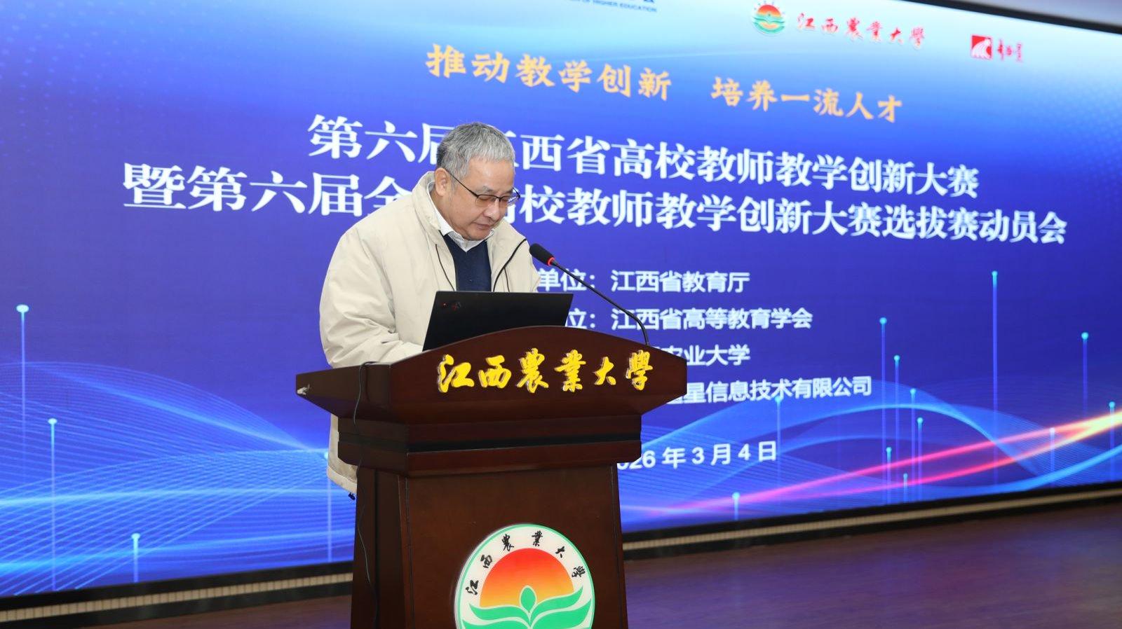 3月4日,由江西省教育厅指导、江西省高等教育学会主办、江西农业大学承办的第六届江西省高校教师教学创新大赛暨第六届全国高校教师教学创新大赛选拔赛动员会在我校顺利召开。江西省教育厅三级调研员谢莲花,江西省高等教育学会副会长兼秘书长肖德征,江西省高校师资培训中心主任、省高等教育学会副秘书长周贵忠,江西农业大学党委常委、副校长王文君出席会议,我校教务处主要负责人主持会议。全省各高校大赛负责人、主讲教师近100人现场参会,1700余名教师通过线上方式同步参会。