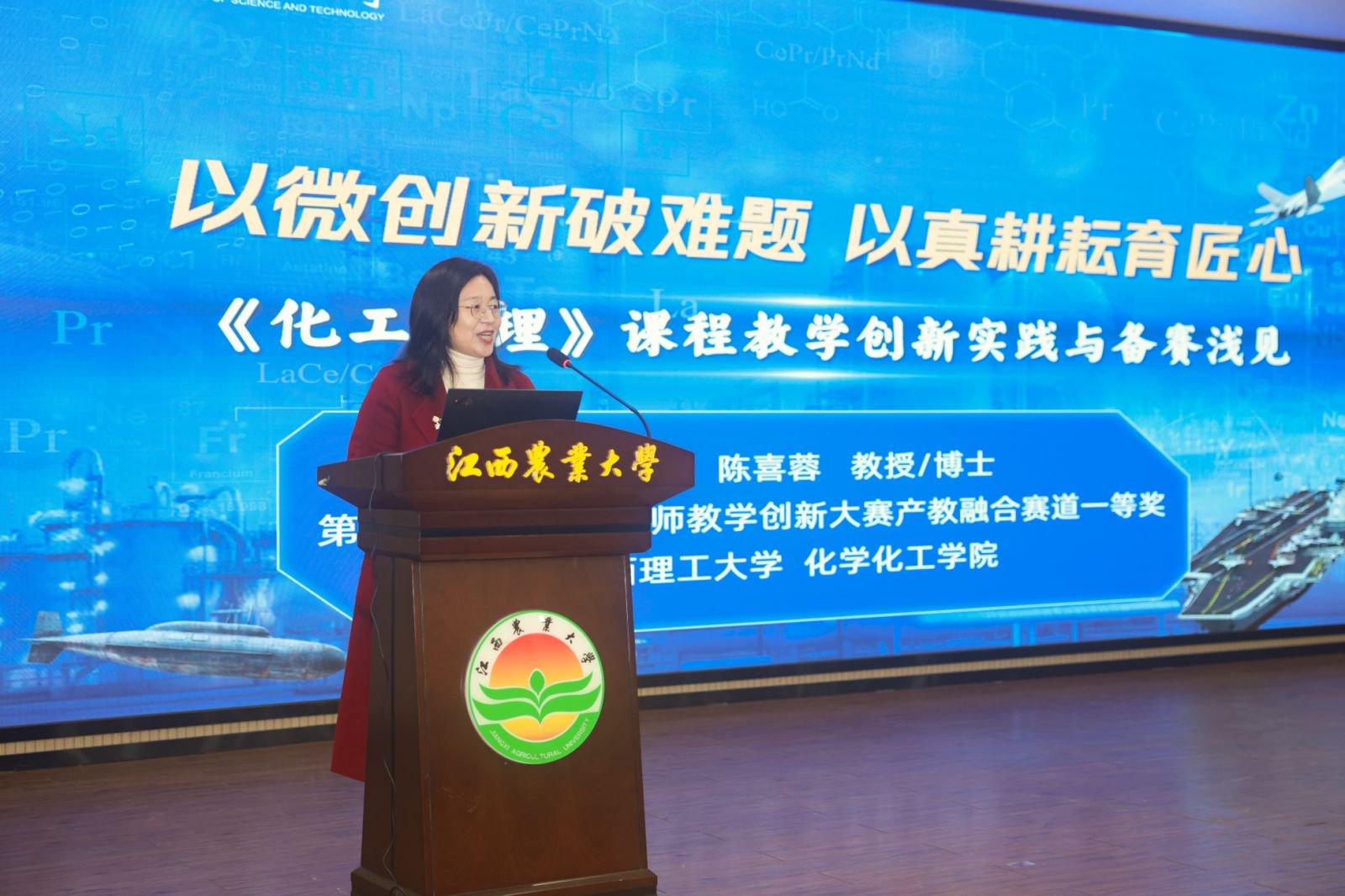 会议特邀第五届全国高校教师教学创新大赛产教融合赛道一等奖获得者陈喜蓉教授作专题报告。陈喜蓉以《以微创新破难题 以真耕耘育匠心—〈化工原理〉课程教学创新实践与备赛浅见》为题,结合自身参赛经验,围绕课程教学创新设计、参赛材料打磨等方面分享备赛技巧,内容兼具理论高度与实践指导意义,为参赛教师明晰了备赛思路。